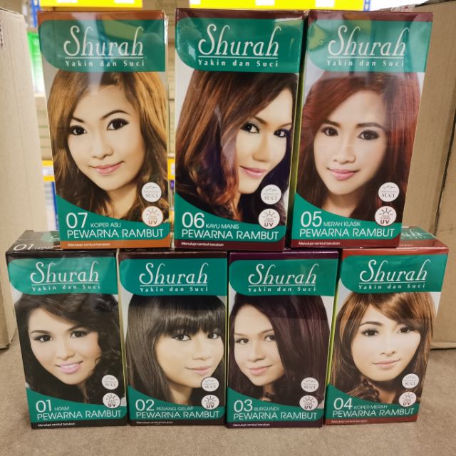 . Shurah pewarna rambut terdiri daripada 7 varian warna yang menawan. Pewarna rambut halal terbaik dan diyakini di Malaysia 2022. Pewarna rambut Shurah juga boleh didapati dalam pek kecil dan kit.